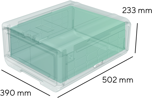 THE BOX can be used in two configurations to ship items from the size of a SIM-card or a book with a maximum of 1 liter storage space up to two shoeboxes with a volume of 25 liters of storage space. Our automatic holding system eliminates the need for bubble wrap and holds your valuable goods safely in place for transportation.
